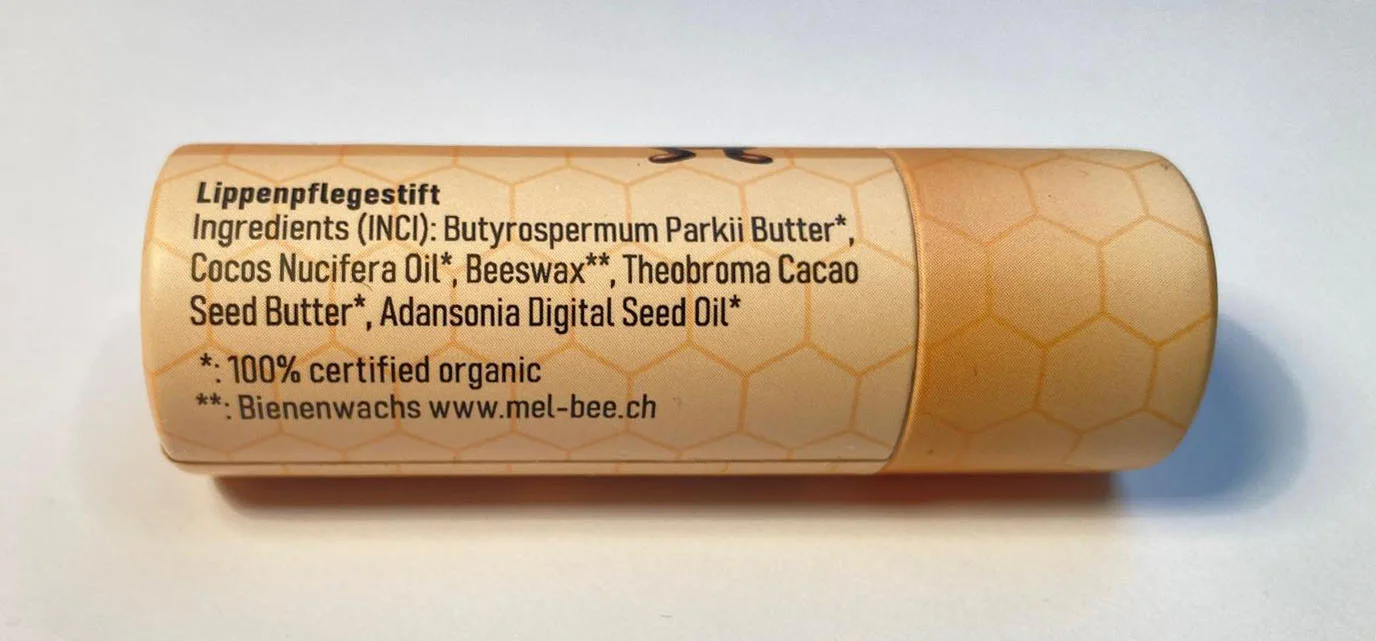 Inhaltsstoffe: Butyrospermum Parkii Butter, Cocos Nucifera Oil, Beeswax (Bienenwachs mel-bee.ch), Theobroma Cacao Seed Butter, Adansonia Digitata Seed Oil